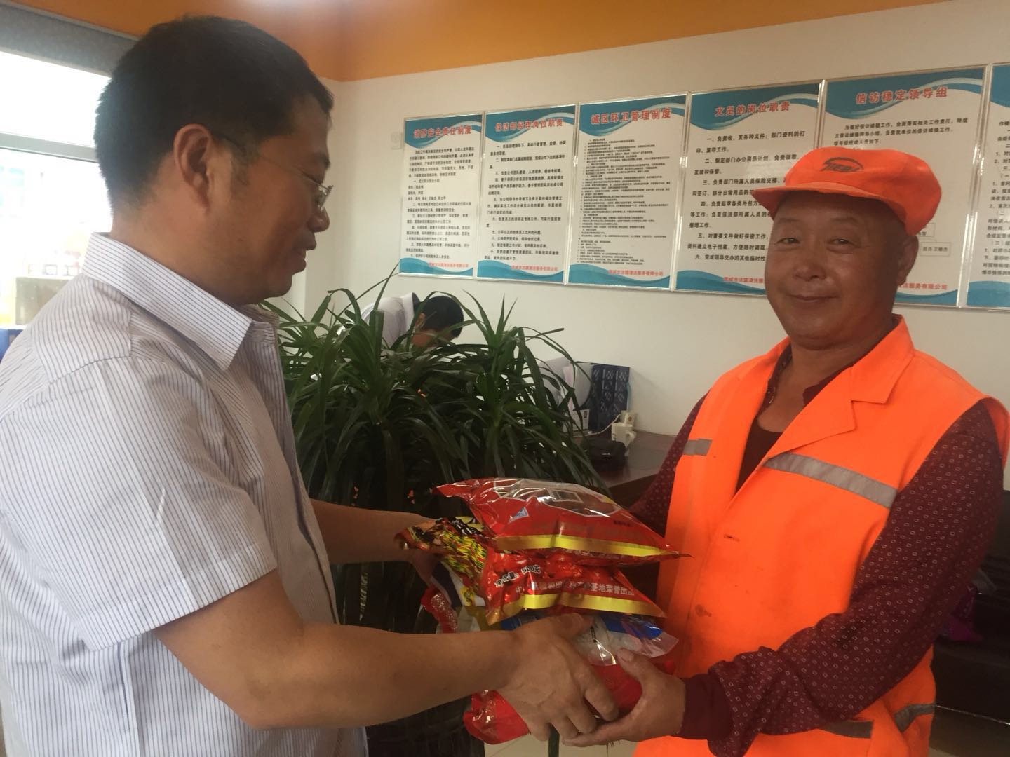 端午節(jié)來臨之際,為弘揚傳統(tǒng)文化,我公司按照傳統(tǒng)習俗為環(huán)衛(wèi)工準備了節(jié)日禮品。濃濃棕香,綿綿情長。6月5日下午,在一年一度的端午佳節(jié)來臨之際,一袋袋香香的糯米、大大的紅棗、白糖、冰糖飽含著公司關(guān)愛和祝福的端陽節(jié)福利由公司領(lǐng)導親自發(fā)放到為美化城區(qū)大街小巷作出默默奉獻的公司環(huán)衛(wèi)工人手中。