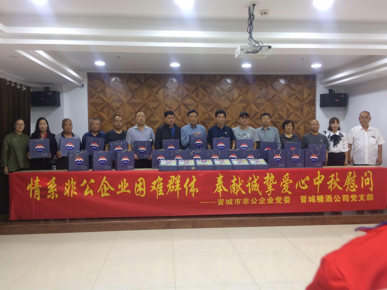 最后,在潔霸公司黨群活動(dòng)室,市非公企業(yè)黨委李凱霞科長(zhǎng)和晉城糖酒公司黨支部、貴州茅臺(tái)山西省晉城糖酒專賣店的工作人員為困難黨員發(fā)放了月餅,并和大家合影留念。