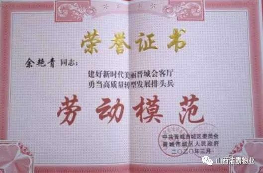 余艷青同志自2015年進(jìn)入潔霸以來(lái),一直奮斗在工程部的第一線從事主管工作。工作中,余艷青同志愛(ài)崗敬業(yè),遵守職業(yè)道德,為人誠(chéng)實(shí)守信;她熱愛(ài)工作,對(duì)待客戶(hù)熱情周到、耐心細(xì)致;工作中團(tuán)結(jié)同事,責(zé)任心強(qiáng),吃苦耐勞,服從大局,以公司的利益為重。在我市開(kāi)展的“三洗六見(jiàn)一紅旗”活動(dòng)和全國(guó)文明城市的創(chuàng)建活動(dòng)中,她帶領(lǐng)員工高標(biāo)準(zhǔn)、高質(zhì)量、高效率地完成清洗美化工作,為扮靚晉城形象,打造城市優(yōu)美環(huán)境做出了突出貢獻(xiàn)。先后多次被公司評(píng)為優(yōu)秀員工等,2019年在公司成立20周年慶之際,她又被公司授予“潔霸工匠”稱(chēng)號(hào)。