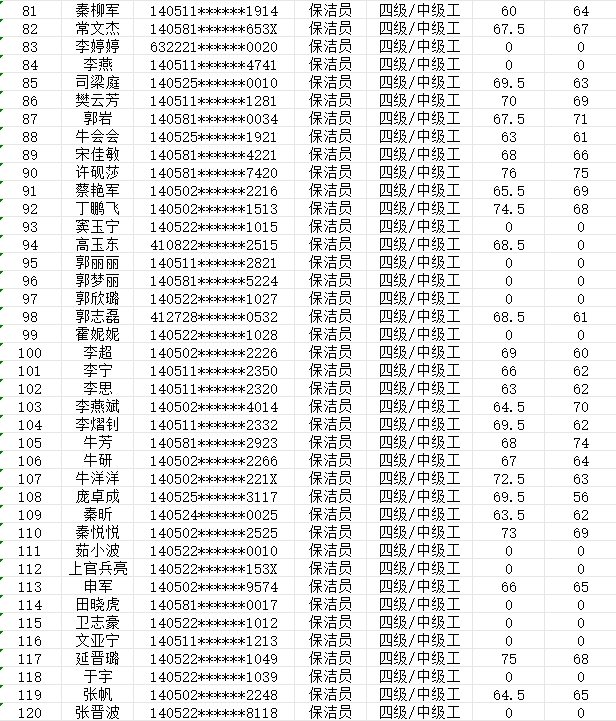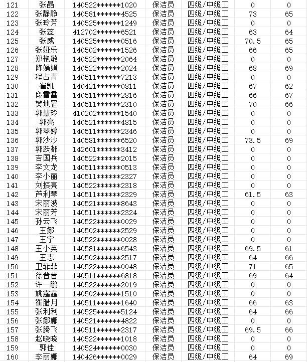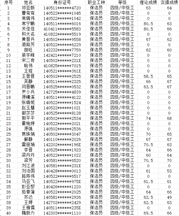 晉城市潔霸清潔服務(wù)股份有限公司職業(yè)技能等級認(rèn)定中心現(xiàn)將2024年2月3日認(rèn)定人員成績公示如下: