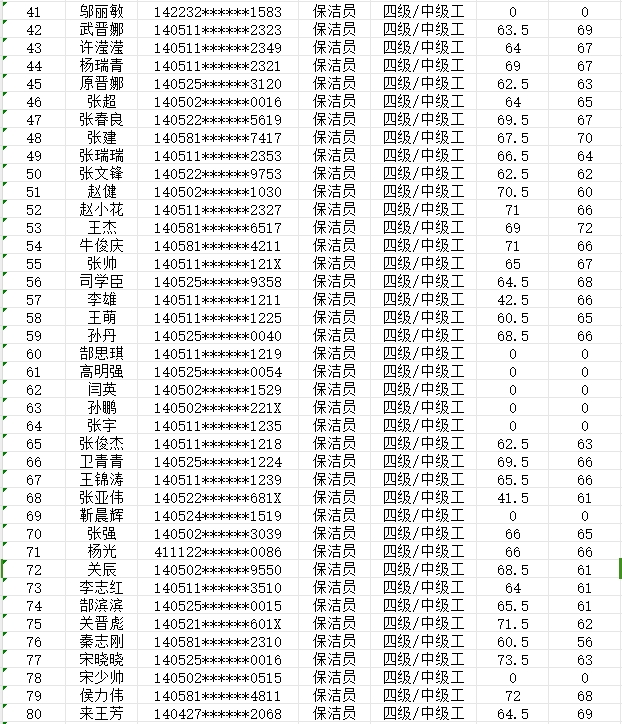 晉城市潔霸清潔服務(wù)股份有限公司職業(yè)技能等級認(rèn)定中心2024年2月3日第9批保潔員中級認(rèn)定人員成績公示