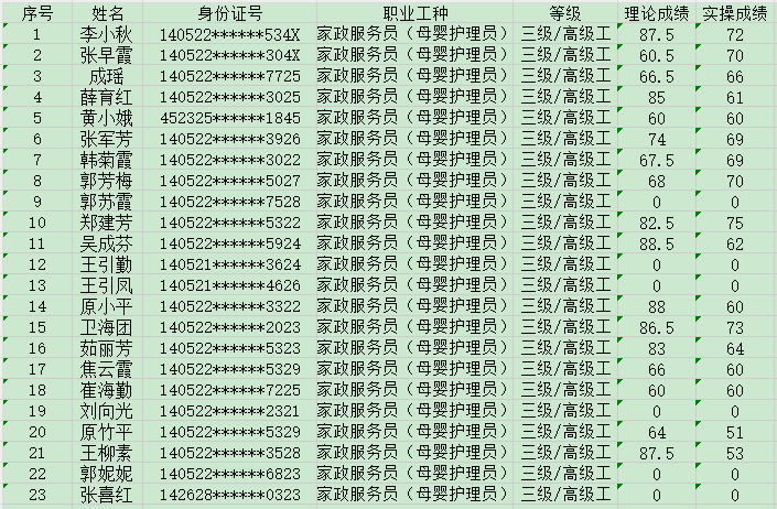晉城市潔霸清潔服務(wù)股份有限公司職業(yè)技能等級認定中心2024年5月20日上午第13批家政服務(wù)員高級認定人員成績公示