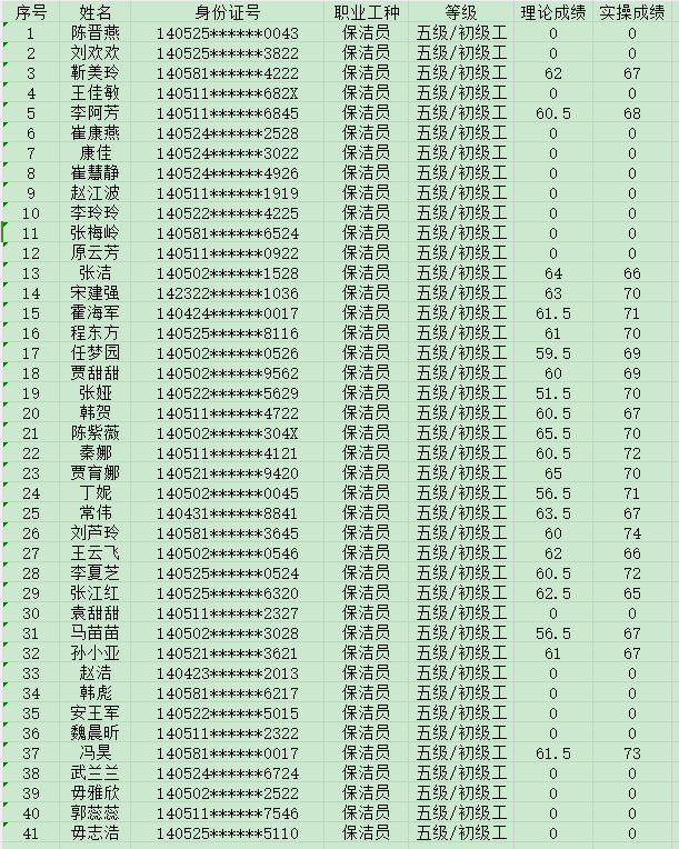 晉城市潔霸清潔服務(wù)股份有限公司職業(yè)技能等級認定中心2024年8月4日第27批保潔員初級認定人員成績公示