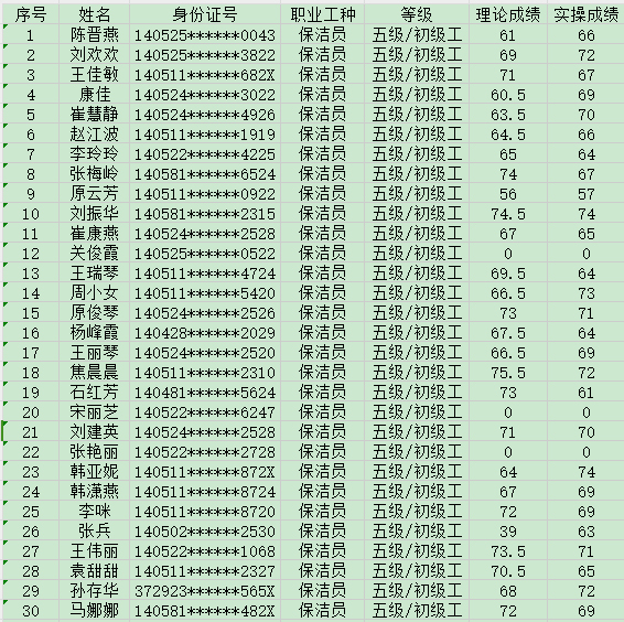 2024年8月18日第30批保潔員初級認定人員成績公示