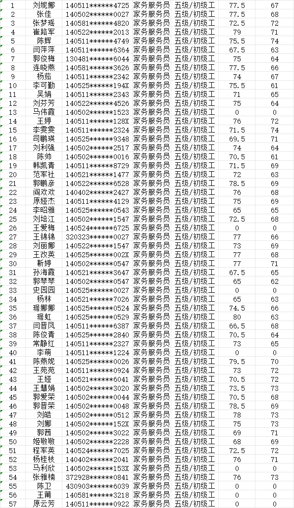 晉城市潔霸清潔服務(wù)股份有限公司職業(yè)技能等級認定中心2024年9月21日第39批家政服務(wù)員初級認定人員成績公示