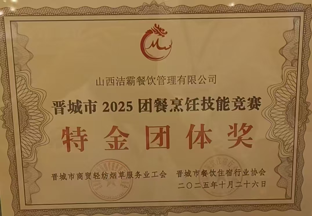 10月26日,由晉城市總工會、晉城市商務(wù)局、晉城市人力資源和社會保障局主辦,晉城市商貿(mào)輕紡煙草服務(wù)業(yè)工會委員會、晉城市餐飲住宿行業(yè)協(xié)會承辦的“情系職工 美好食光”晉城市2025團(tuán)餐烹飪技能競賽在高都大酒店圓滿落幕,山西潔霸餐飲管理有限公司斬獲“特金團(tuán)體獎”。